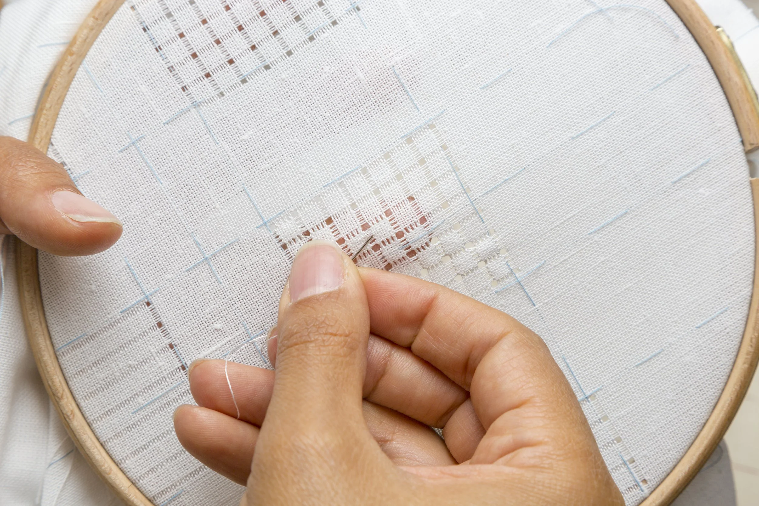 You will master specialized techniques such as drawn thread work, hemstitching, and decorative stitches including Schwalm, Canarian, Traditional, and Richelieu styles.