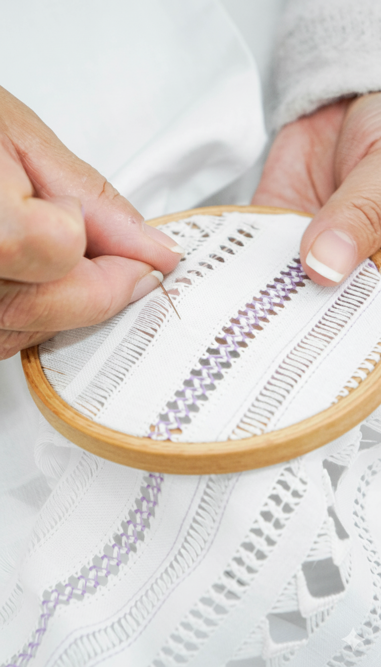 Through a blend of geometric principles and professional transfer techniques, you will learn to design balanced compositions and master advanced processes such as drawn thread work, hemstitching, and decorative openwork stitches achieving clean, high‑quality finishes that elevate any piece.